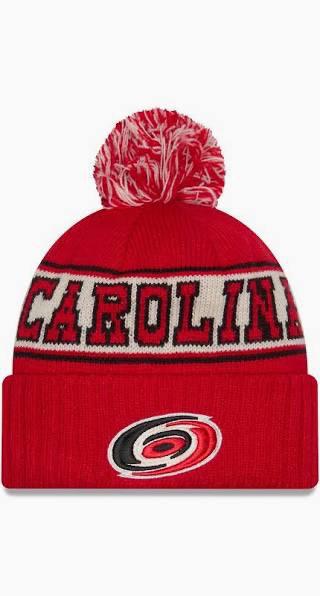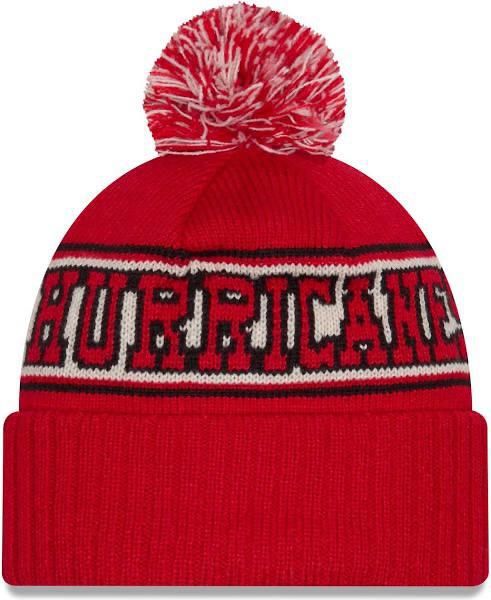 The Carolina Hurricanes Retro Pom Knit Hat features an embroidered Hurricanes logo at the front cuff with a team wordmark at the crown and a one-time removable pom.